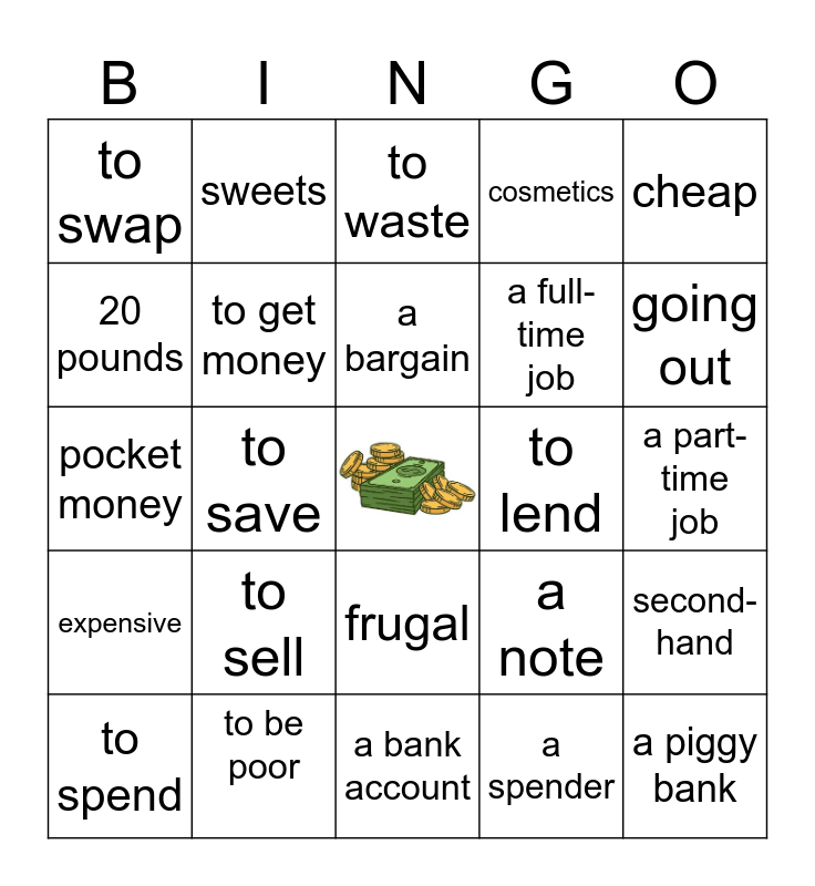 This bingo card has a free space and 29 words: to spend, to earn, to save, to buy, to swap, to waste, to get money, to sell, to lend, to be poor, a part-time job, a piggy bank, a bank account, a spender, going out, mean, frugal, expensive, cheap, pocket money, a note, a coin, a full-time job, 20 pounds, cosmetics, sweets, second-hand, a bargain and jewellery.