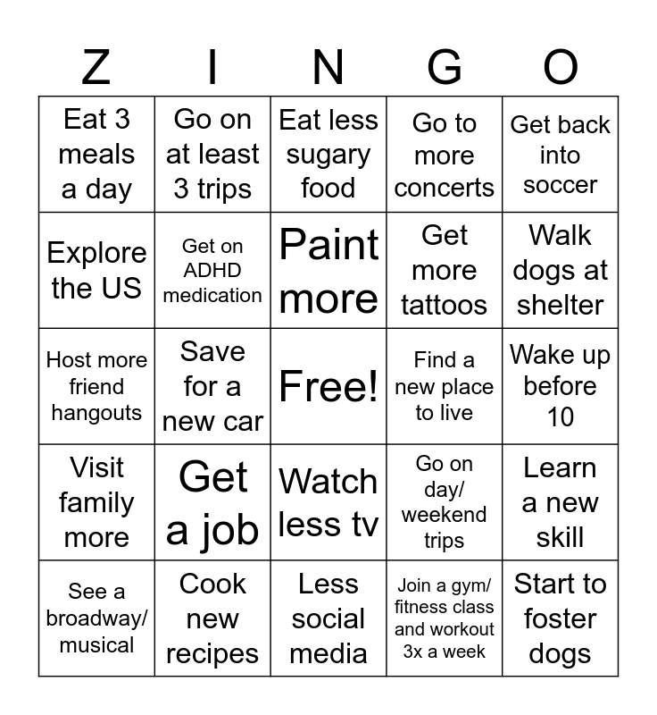 This bingo card has a free space and 24 words: Get a job, Cook new recipes, Paint more, See a broadway/ musical, Get back into soccer, Eat 3 meals a day, Explore the US, Go on at least 3 trips, Find a new place to live, Watch less tv, Get more tattoos, Host more friend hangouts, Go on day/ weekend trips, Learn a new skill, Get on ADHD medication, Join a gym/ fitness class and workout 3x a week, Wake up before 10, Eat less sugary food, Walk dogs at shelter, Save for a new car, Start to foster dogs, Visit family more, Go to more concerts and Less social media.