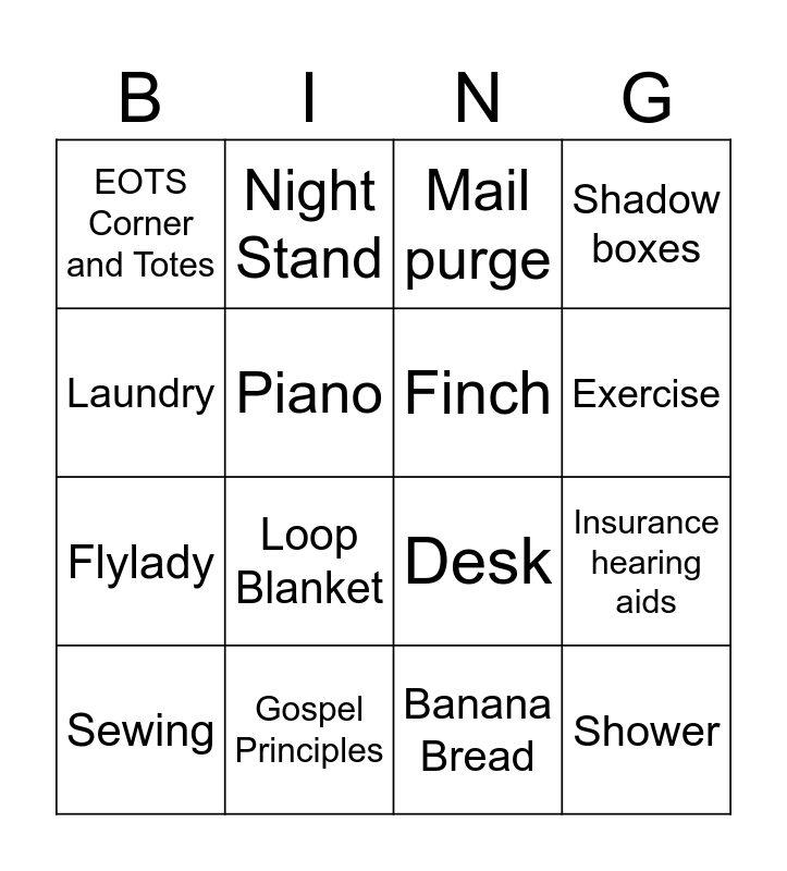 This bingo card has 16 words: Gospel Principles, Insurance hearing aids, Mail purge, EOTS Corner and Totes, Flylady, Night Stand, Desk, Banana Bread, Laundry, Piano, Sewing, Shadow boxes, Loop Blanket, Exercise, Finch and Shower.