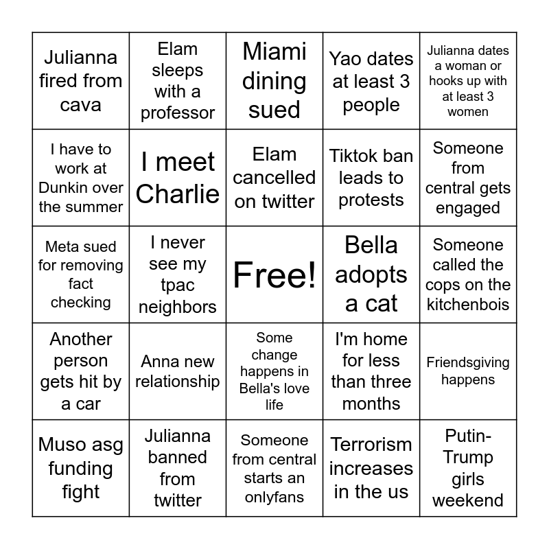 This bingo card has a free space and 24 words: Anna new relationship, Julianna banned from twitter, Elam cancelled on twitter, Muso asg funding fight, Julianna dates a woman or hooks up with at least 3 women, Julianna fired from cava, I have to work at Dunkin over the summer, Elam sleeps with a professor, Bella adopts a cat, Some change happens in Bella's love life, Tiktok ban leads to protests, Meta sued for removing fact checking, I'm home for less than three months, Friendsgiving happens, I meet Charlie, Terrorism increases in the us, Someone called the cops on the kitchenbois, Miami dining sued, Someone from central gets engaged, I never see my tpac neighbors, Putin-Trump girls weekend, Another person gets hit by a car, Yao dates at least 3 people and Someone from central starts an onlyfans.