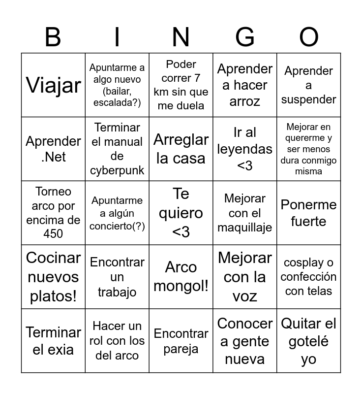 This bingo card has a free space and 24 words: Encontrar un trabajo, Hacer un rol con los del arco, Arreglar la casa, Terminar el exia, Aprender a suspender, Viajar, Aprender .Net, Apuntarme a algo nuevo (bailar, escalada?), Mejorar con el maquillaje, Arco mongol!, Ir al leyendas <3, Torneo arco por encima de 450, Mejorar con la voz, cosplay o confección con telas, Terminar el manual de cyberpunk, Conocer a gente nueva, Ponerme fuerte, Poder correr 7 km sin que me duela, Mejorar en quererme y ser menos dura conmigo misma, Apuntarme a algún concierto(?), Quitar el gotelé yo, Cocinar nuevos platos!, Aprender a hacer arroz and Encontrar pareja.