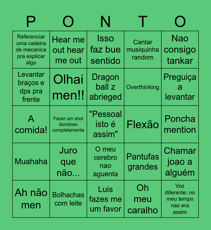This bingo card has 26 words: O meu cerebro nao aguenta, Oh meu caralho, Dragon ball z abrieged, Bolhachas com leite, Nao consigo tankar, Referenciar uma cadeira de mecanica pra explicar algo, Levantar braços e dps pra frente, Hear me out hear me out, Poncha mention, Pantufas grandes, Overthinking, A comida!, Chamar joao a alguém, Ah não men, Fazer um shot duvidoso completamente, Deitar no chão, Cantar musiquinha random, Muahaha, Isso faz bue sentido, "Pessoal isto é assim", Preguiça a levantar, Luis fazes me um favor, Flexão, Juro que não..., Olhai men!! and Voz diferente: no meu tempo nao era assim.
