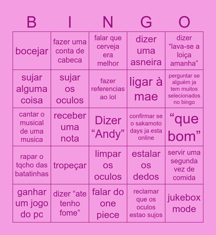 This bingo card has 38 words: Yamete!, Partir alguma coisa, proprio comando “desliga-se”, sujar os oculos, servir uma segunda vez de comida, tropeçar, fazer referencias ao lol, falar de carros, dizer “lava-se a loiça amanha”, ligar à mae, receber uma nota, dizer uma asneira, Dizer “Andy”, “que bom”, sujar alguma coisa, rapar o tqcho das batatinhas, não gostar de alguma bebida, falar que cerveja era melhor, rir-se alto e fininho, confirmar se o sakamoto days ja esta online, bocejar, dizer “ate tenho fome”, perguntar se alguém ja tem muitos selecionados no bingo, ganhar um jogo do pc, falar das horas, falar do one piece, jukebox mode, usar ingles e português na mesma frase, dar quote em alguma frase do lol, dar quote em alguma frase de anime, fazer o duolingo, limpar os oculos, reclamar que os oculos estao sujos, fazer uma conta de cabeca, trocar se para o pijaminha, estalar os dedos, cantar o musical de uma musica and tentar ver as horas no relogio.