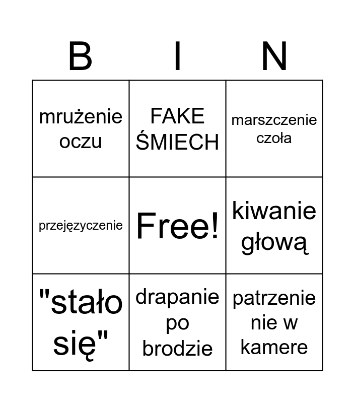 This bingo card has a free space and 10 words: drapanie po brodzie, marszczenie czoła, mrużenie oczu, patrzenie nie w kamere, przejęzyczenie, "stało się", FAKE ŚMIECH, wytrzeszczanie oczu, kiwanie głową and mlaśnięcie.