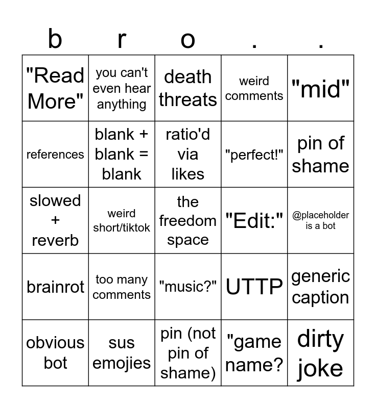 This bingo card has a free space and 38 words: emoji spam, regulaar english conventions, no punctuation, blank + blank = blank, generic caption, too many comments, ratio'd via likes, ratio'd via replies, "mid", "perfect!", weird short/tiktok, weird comments, dirty joke, @placeholder is a bot, references, brainrot, roasting, death threats, comment deleted, "Edit:", "Read More", sus emojies, pin of shame, obvious bot, "i heard if you..." "...you'll get pinned", pin (not pin of shame), sus comments, wow!!, "🗣", "🗣🔥🔥🔥", bot name, "music?", "game name?, you can't even hear anything, alternate title, UTTP, slowed + reverb and sped up.