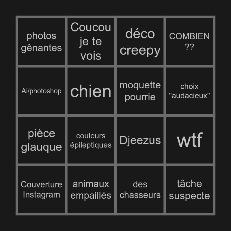 This bingo card has 39 words: lampe néné, une déco coq, moquette dans la sdb, moquette pourrie, moquette moche, papier peint pourri, choix "audacieux", Ambiance mémé, Ai/photoshop, tâche suspecte, wtf, COMBIEN ??, Couverture Instagram, des chasseurs, animaux empaillés, des drapeaux américains partout, des citations sur les murs, photos gênantes, architecte bourré, chat, chien, déco mono-maniaque, pièce glauque, couleurs épileptiques, ça mérite un coup de balais, syndrôme de Diogène, cache misère, wtf, frise de merde, Coucou je te vois, lampe ventilo, tâche au plafond, déco creepy, double garage, Ruines, Marches de la mort, Peintures bizarres, Djeezus and Thème exorciste.