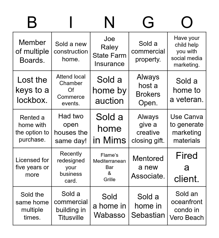 This bingo card has a free space and 67 words: Had three closings in one day., Sold a home in South Vero, Sold a home on three acres., Fired a client., Sold a home in Melbourne Beach, Refused a listing., Sold a new construction home., Sold five homes this month for cash!, Sold a home by auction, D•R• HORTON, Flame’s Mediterranean Bar & Grille, Have a QR code on your business card., Use Canva to generate marketing materials, Have your child help you with social media marketing., Listed a home for $1,000,000, Lost the keys to a lockbox., Had two open houses the same day!, Member of multiple Boards., Use Twitter & Instagram, Always host a Brokers Open., Recently redesigned your business card., Licensed for five years or more, Sold a commercial property., Sold a home in Sebastian, Sold a condo in Titusville, Experior Financial Group, Sold a home in PSL, Member of the Realtors Association of IRC, Sold a home to a veteran., Sold a home to a family friend., Sold an oceanfront condo in Vero Beach, Sold a home to a local teacher., Purchased an investment property., Sold a condo at Harbor Island Beach Club., Sold a home with owner financing., Sold the same home multiple times., Support local charities, Mentored a new Associate., Rented a home with the option to purchase., Listed and sold a home on the same day!, Flipped multiple homes., Attend local Chamber Of Commerce events., Always give a creative closing gift., Sold a home in Palm City, Sold a commercial property in Martin County, Sold a home for 3,000,000, Sold a lot in Palm Bay, Sold a commercial building in Titusville, Sold an oceanfront property, Referred one of our participating sponsors, Joe Raley State Farm Insurance, R&R Adjusting Group, The Mortgage Firm, Sold a triplex, Sold a home in Little Hollywood, Sold a home in Wabasso, Palm Bay Air Care Experts, Todo Junk Removal & Pressure Washing, Quach’s Quality Electrical Services, Sold vacant land in Fellsmere, Xact Fence Solutions, Elite Home Inspections, Atypical Title LLC, Launch School of Real Estate, Koeal Braxton Photography, Pittman & Son’s and B2K12 Branding Solutions.