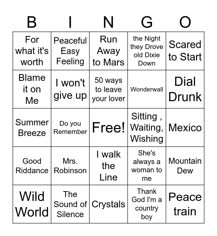 This bingo card has a free space and 25 words: Mrs. Robinson, Crystals, 50 ways to leave your lover, Wild World, Scared to Start, For what it's worth, Blame it on Me, Peaceful Easy Feeling, Sitting , Waiting, Wishing, I walk the Line, Wonderwall, Summer Breeze, She's always a woman to me, Mountain Dew, I won't give up, If you want to sing out, sing out, Mexico, Run Away to Mars, Dial Drunk, Do you Remember, Peace train, The Sound of Silence, Good Riddance, the Night they Drove old Dixie Down and Thank God I'm a country boy.