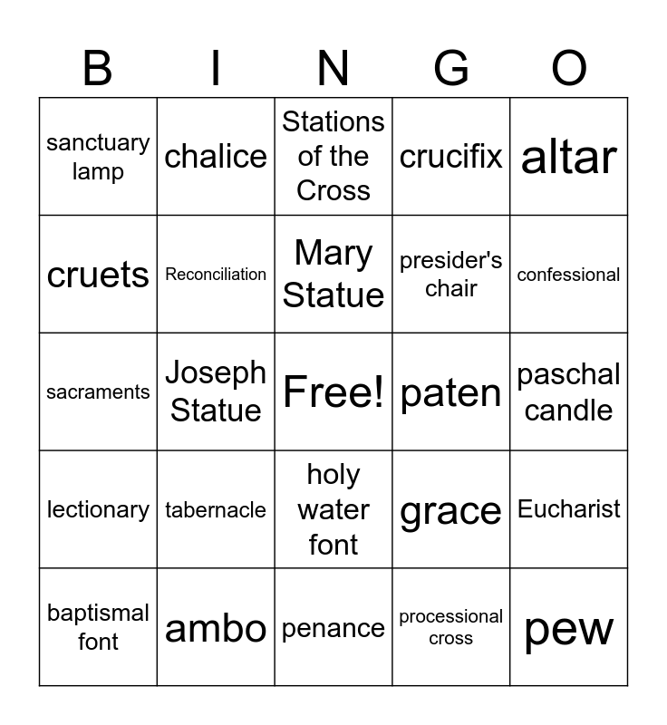 This bingo card has a free space and 24 words: tabernacle, ambo, Mary Statue, baptismal font, altar, sanctuary lamp, cruets, chalice, paten, holy water font, presider's chair, sacraments, grace, Eucharist, Reconciliation, processional cross, paschal candle, Stations of the Cross, confessional, Joseph Statue, pew, lectionary, crucifix and penance.