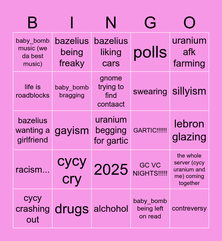 This bingo card has a free space and 24 words: cycy crashing out, cycy cry, gnome trying to find contaact, baby_bomb being left on read, uranium afk farming, baby_bomb music (we da best music), bazelius being freaky, bazelius liking cars, GARTIC!!!!!!, lebron glazing, bazelius wanting a girlfriend, baby_bomb bragging, GC VC NIGHTS!!!!!, the whole server (cycy uranium and me) coming together, life is roadblocks, drugs, alchohol, polls, sillyism, racism..., gayism, 2025, swearing and contreversy.