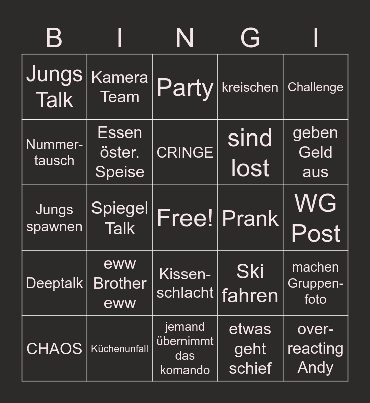This bingo card has a free space and 24 words: eww Brother eww, Küchenunfall, CRINGE, CHAOS, Challenge, Jungs Talk, Nummer-tausch, Kamera Team, Prank, Kissen-schlacht, sind lost, Jungs spawnen, Ski fahren, machen Gruppen- foto, Essen öster. Speise, etwas geht schief, WG Post, Party, geben Geld aus, Spiegel Talk, over-reacting Andy, Deeptalk, kreischen and jemand übernimmt das komando.