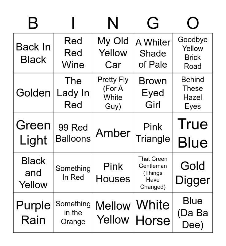This bingo card has 57 words: Free!, Purple Rain, Tangled up in Blue, Back In Black, Mellow Yellow, Behind Blue Eyes, The Lady In Red, White Wedding, Brown Eyed Girl, Mr. Blue Sky, A Whiter Shade of Pale, Big Yellow Taxi, Little Red Corvette, Fields Of Gold, Red Rain, Black Magic Woman, Goodbye Yellow Brick Road, 99 Red Balloons, Band Of Gold, Amber, Pink Triangle, Grey Street, That Green Gentleman (Things Have Changed), My Old Yellow Car, Old Yellow Bricks, Pretty Fly (For A White Guy), Orange Crush, Black Hole Sun, Behind These Hazel Eyes, Little Black Dress, Black Horse And The Cherry Tree, Counting Blue Cars, Blue, White Flag, True Blue, Golden, Men In Black, Green Light, Brown Sugar, Black and Yellow, Red Red Wine, Pink Houses, Blue (Da Ba Dee), Green River, The Pink Panther Theme, Orange Colored Sky, Something In Red, Something in the Orange, White Rabbit, Purple Haze, The Purple People Eater, White Horse, Yellow Submarine, Ruby Tuesday, Gold Dust Woman, Gold Digger and Silver Dagger.