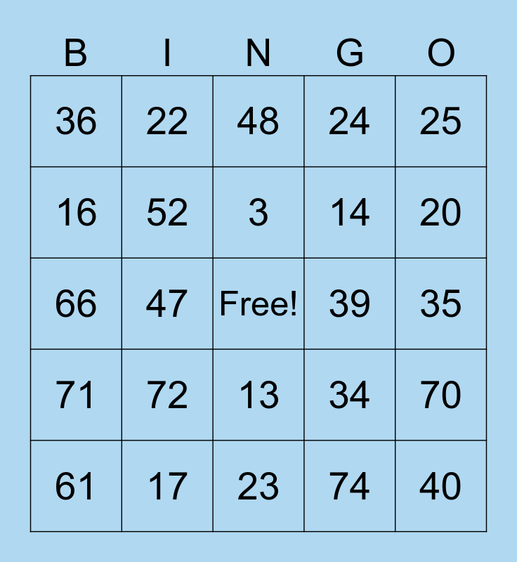 This bingo card has a free space and 75 words: 1, 2, 3, 4, 5, 6, 7, 8, 9, 10, 11, 12, 13, 14, 15, 16, 17, 18, 19, 20, 21, 22, 23, 24, 25, 26, 27, 28, 29, 30, 31, 32, 33, 34, 35, 36, 37, 38, 39, 40, 41, 42, 43, 44, 45, 46, 47, 48, 49, 50, 51, 52, 53, 54, 55, 56, 57, 58, 59, 60, 61, 62, 63, 64, 65, 66, 67, 68, 69, 70, 71, 72, 73, 74 and 75.