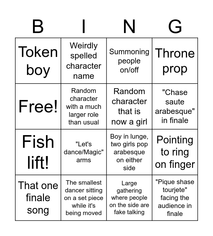 This bingo card has 16 words: The smallest dancer sitting on a set piece while it's being moved, Pointing to ring on finger, Summoning people on/off, Token boy, Fish lift!, Weirdly spelled character name, Boy in lunge, two girls pop arabesque on either side, Large gathering where people on the side are fake talking, Free!, Random character with a much larger role than usual, That one finale song, Throne prop, "Let's dance/Magic" arms, "Chase saute arabesque" in finale, Random character that is now a girl and "Pique shase tourjete" facing the audience in finale.
