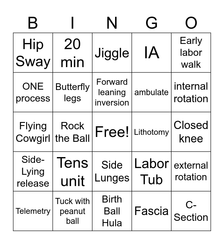 This bingo card has a free space and 24 words: Telemetry, Tens unit, Forward leaning inversion, Fascia, Early labor walk, Hip Sway, 20 min, Jiggle, Lithotomy, Closed knee, Flying Cowgirl, Butterfly legs, Labor Tub, external rotation, ONE process, Tuck with peanut ball, Birth Ball Hula, IA, internal rotation, Side-Lying release, Rock the Ball, Side Lunges, ambulate and C-Section.