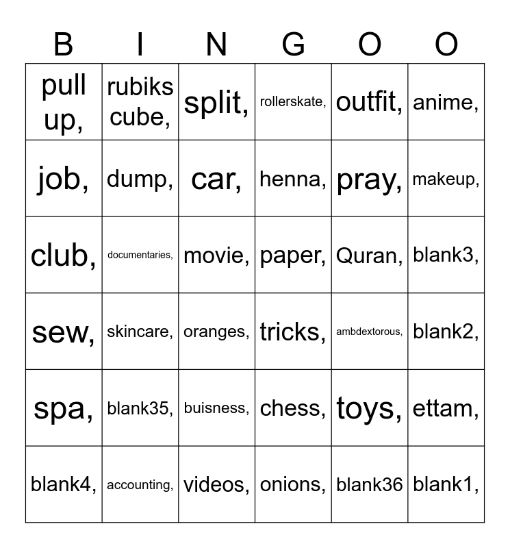This bingo card has 36 words: chess,, buisness,, onions,, job,, sew,, paper,, dump,, videos,, outfit,, toys,, makeup,, rollerskate,, ettam,, documentaries,, henna,, pull up,, spa,, Quran,, club,, split,, movie,, skincare,, tricks,, oranges,, ambdextorous,, rubiks cube,, pray,, accounting,, car,, anime,, blank1,, blank4,, blank2,, blank3,, blank35, and blank36.