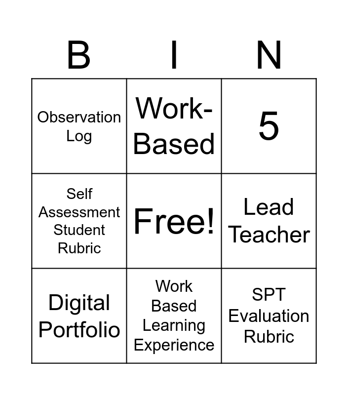 This bingo card has a free space and 14 words: 20, Supervising Practicum Teacher, Digital Portfolio, Work-Based, Self Assessment Student Rubric, SPT Evaluation Rubric, EdRising, Evidence of Learning, Work Based Learning Experience, Observation Log, Digital Portfolio, Lead Teacher, 5 and Practicum.