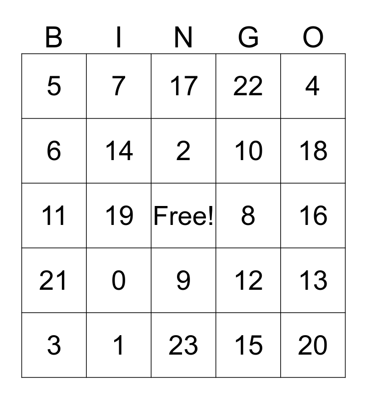 This bingo card has a free space and 24 words: 0, 1, 2, 3, 4, 5, 6, 7, 8, 9, 10, 11, 12, 13, 14, 15, 16, 17, 18, 19, 20, 21, 22 and 23.
