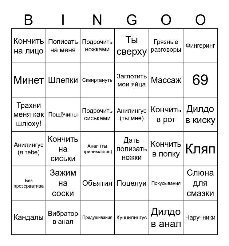 This bingo card has 36 words: Поцелуи, Объятия, Куннилингус, Минет, Анилингус (я тебе), Анилингус (ты мне), Шлепки, Придушивания, Грязные разговоры, Покусывания, 69, Ты сверху, Слюна для смазки, Пощёчины, Заглотить мои яйца, Кончить на лицо, Без презерватива, Кончить в рот, Трахни меня как шлюху!, Подрочить ножками, Подрочить сиськами, Кончить на сиськи, Дать полизать ножки, Анал (ты принимаешь), Кончить в попку, Пописать на меня, Массаж, Вибратор в анал, Сквиртануть, Фингеринг, Наручники, Кандалы, Кляп, Дилдо в киску, Зажим на соски and Дилдо в анал.