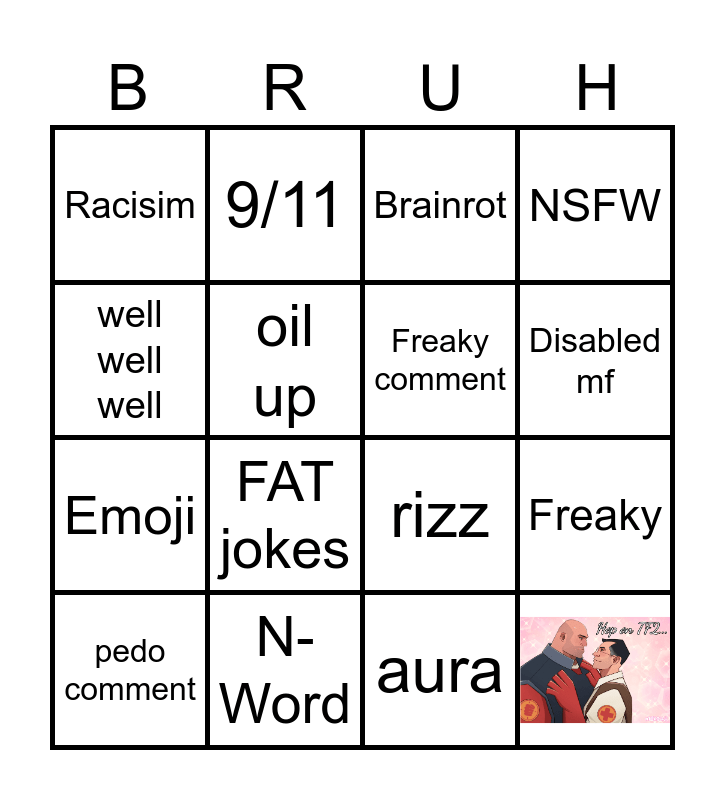 This bingo card has 1 images and 15 words: N-Word, Freaky, Brainrot, Racisim, Emoji, 9/11, rizz, aura, well well well, oil up, pedo comment, NSFW, FAT jokes, Disabled mf and Freaky comment.