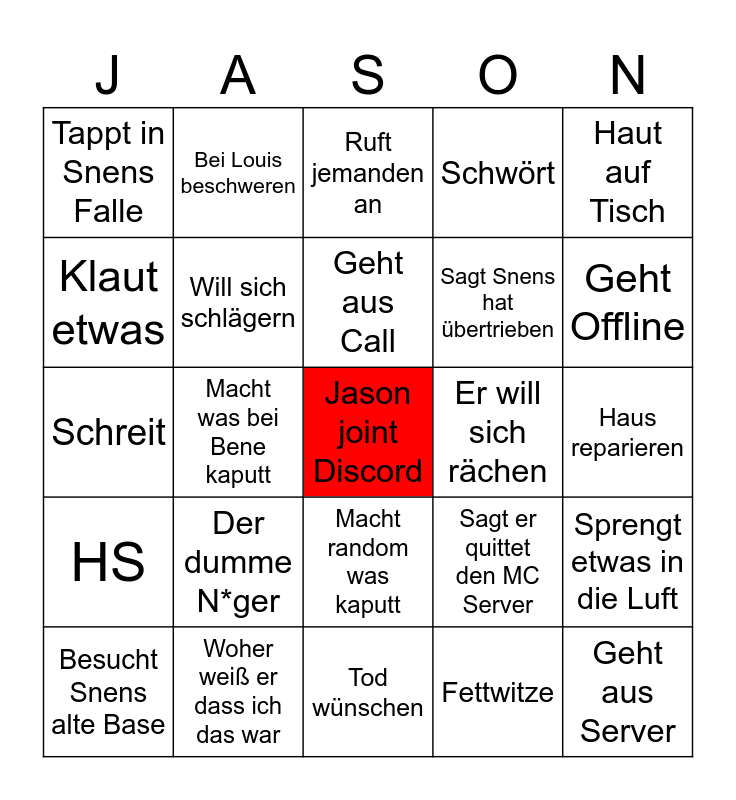 This bingo card has a free space and 24 words: Der dumme N*ger, Woher weiß er dass ich das war, Geht aus Call, Besucht Snens alte Base, Haut auf Tisch, Tappt in Snens Falle, Klaut etwas, Bei Louis beschweren, Er will sich rächen, Macht random was kaputt, Sagt Snens hat übertrieben, Schreit, Sagt er quittet den MC Server, Sprengt etwas in die Luft, Will sich schlägern, Fettwitze, Haus reparieren, Ruft jemanden an, Geht Offline, Macht was bei Bene kaputt, Geht aus Server, HS, Schwört and Tod wünschen.