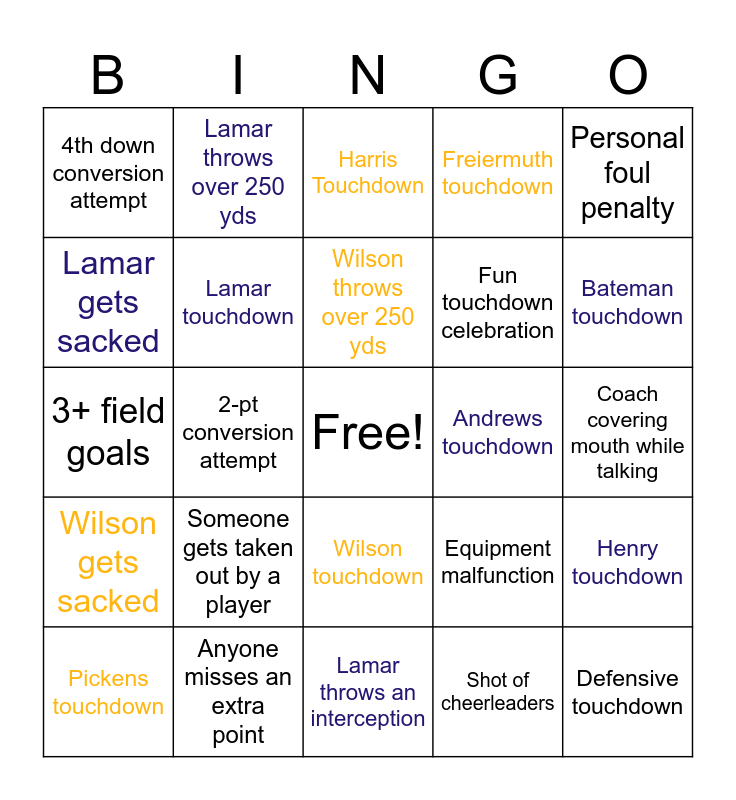 This bingo card has a free space and 28 words: Henry touchdown, Austin III touchdown, Fun touchdown celebration, Shot of cheerleaders, Lamar gets sacked, Harris Touchdown, Lamar throws over 250 yds, Wilson gets sacked, Andrews touchdown, Pickens touchdown, 3+ field goals, Freiermuth touchdown, Anyone misses an extra point, Lamar throws an interception, Bateman touchdown, Wilson throws an interception, Someone gets taken out by a player, Lamar touchdown, Wilson throws over 250 yds, Wilson touchdown, 4th down conversion attempt, Henry rushes over 100 yds, Defensive touchdown, 2-pt conversion attempt, Coach covering mouth while talking, Equipment malfunction, Personal foul penalty and Field goal over 55 yds.