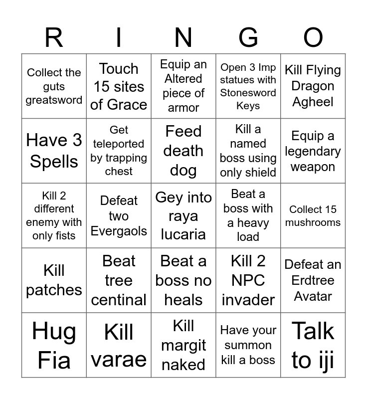 This bingo card has a free space and 24 words: Beat tree centinal, Kill varae, Feed death dog, Hug Fia, Kill Flying Dragon Agheel, Collect the guts greatsword, Have 3 Spells, Touch 15 sites of Grace, Beat a boss with a heavy load, Beat a boss no heals, Kill a named boss using only shield, Kill 2 different enemy with only fists, Kill 2 NPC invader, Defeat an Erdtree Avatar, Get teleported by trapping chest, Have your summon kill a boss, Collect 15 mushrooms, Equip an Altered piece of armor, Equip a legendary weapon, Defeat two Evergaols, Talk to iji, Kill patches, Open 3 Imp statues with Stonesword Keys and Kill margit naked.
