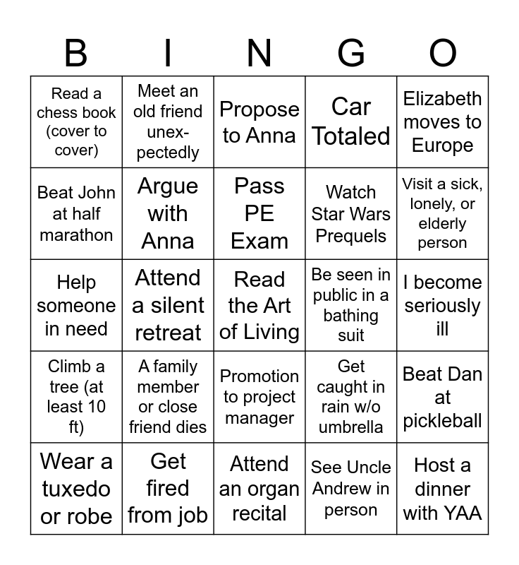 This bingo card has a free space and 24 words: A family member or close friend dies, Get fired from job, Pass PE Exam, Wear a tuxedo or robe, Elizabeth moves to Europe, Read a chess book (cover to cover), Beat John at half marathon, Meet an old friend unex- pectedly, Be seen in public in a bathing suit, Promotion to project manager, Watch Star Wars Prequels, Help someone in need, Get caught in rain w/o umbrella, Beat Dan at pickleball, Argue with Anna, See Uncle Andrew in person, I become seriously ill, Propose to Anna, Visit a sick, lonely, or elderly person, Attend a silent retreat, Host a dinner with YAA, Climb a tree (at least 10 ft), Car Totaled and Attend an organ recital.