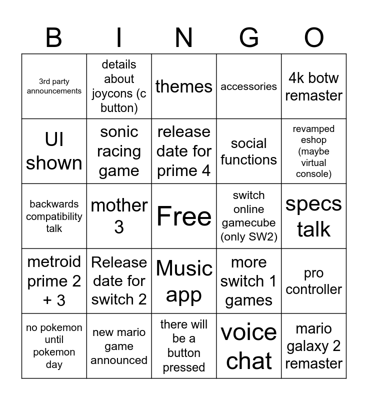 This bingo card has a free space and 24 words: Release date for switch 2, new mario game announced, release date for prime 4, no pokemon until pokemon day, 4k botw remaster, 3rd party announcements, UI shown, details about joycons (c button), switch online gamecube (only SW2), Music app, social functions, backwards compatibility talk, more switch 1 games, pro controller, sonic racing game, voice chat, specs talk, themes, revamped eshop (maybe virtual console), mother 3, mario galaxy 2 remaster, metroid prime 2 + 3, accessories and there will be a button pressed.