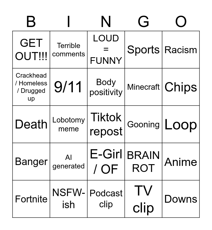 This bingo card has 25 words: AI generated, Podcast clip, Body positivity, Fortnite, Racism, GET OUT!!!, Crackhead / Homeless / Drugged up, Terrible comments, Gooning, E-Girl / OF, Minecraft, Death, BRAIN ROT, Anime, 9/11, Downs, Loop, LOUD = FUNNY, Chips, Lobotomy meme, Tiktok repost, NSFW-ish, Banger, Sports and TV clip.