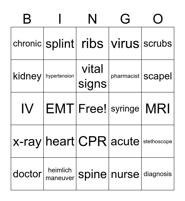 This bingo card has a free space and 24 words: heart, heimlich maneuver, vital signs, doctor, scrubs, chronic, kidney, splint, syringe, CPR, pharmacist, IV, acute, stethoscope, hypertension, nurse, MRI, ribs, scapel, EMT, diagnosis, x-ray, virus and spine.
