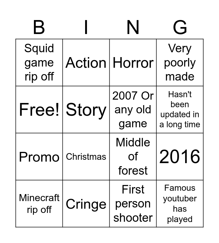 This bingo card has 16 words: Cringe, 2016, Horror, Squid game rip off, Promo, Action, Middle of forest, First person shooter, Free!, Story, Minecraft rip off, Very poorly made, Christmas, Hasn't been updated in a long time, 2007 Or any old game and Famous youtuber has played.