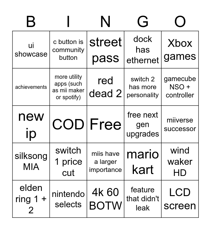 This bingo card has a free space and 24 words: switch 1 price cut, nintendo selects, red dead 2, elden ring 1 + 2, Xbox games, ui showcase, achievements, c button is community button, free next gen upgrades, miis have a larger importance, switch 2 has more personality, new ip, mario kart, wind waker HD, more utility apps (such as mii maker or spotify), feature that didn't leak, miiverse successor, street pass, gamecube NSO + controller, COD, LCD screen, silksong MIA, dock has ethernet and 4k 60 BOTW.