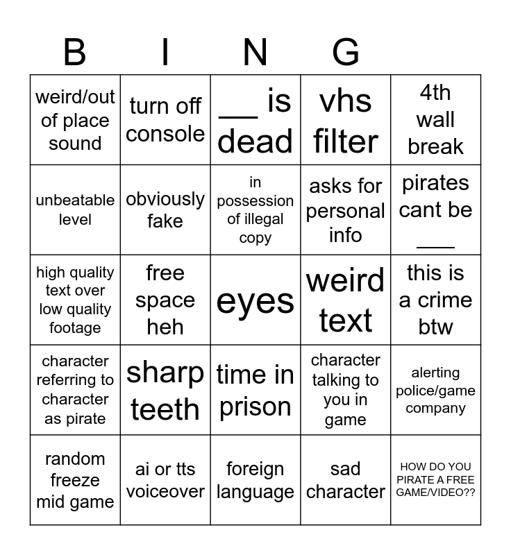 This bingo card has 44 words: sonic.exe esque, eyes, kills player or character, random freeze mid game, threatening player, sad character, __ is dead, cut to black, 4th wall break, ai or tts voiceover, vhs filter, weird text, time in prison, sharp teeth, save file will be deleted, foreign language, instructions manual, high quality text over low quality footage, you are a theif/criminal, pirates cant be ___, turn off console, glitched/black map, character in jail, weird/out of place sound, scary/no music during piracy screen, this is a crime btw, report this, distorted audios/footage, character talking to you in game, character referring to character as pirate, hyperrealism, alerting police/game company, bad grammar, drags on too long, free space heh, Nintendo, jumpscare, HOW DO YOU PIRATE A FREE GAME/VIDEO??, in possession of illegal copy, unbeatable level, asks for personal info, you should buy the actual game, obviously fake and sega.