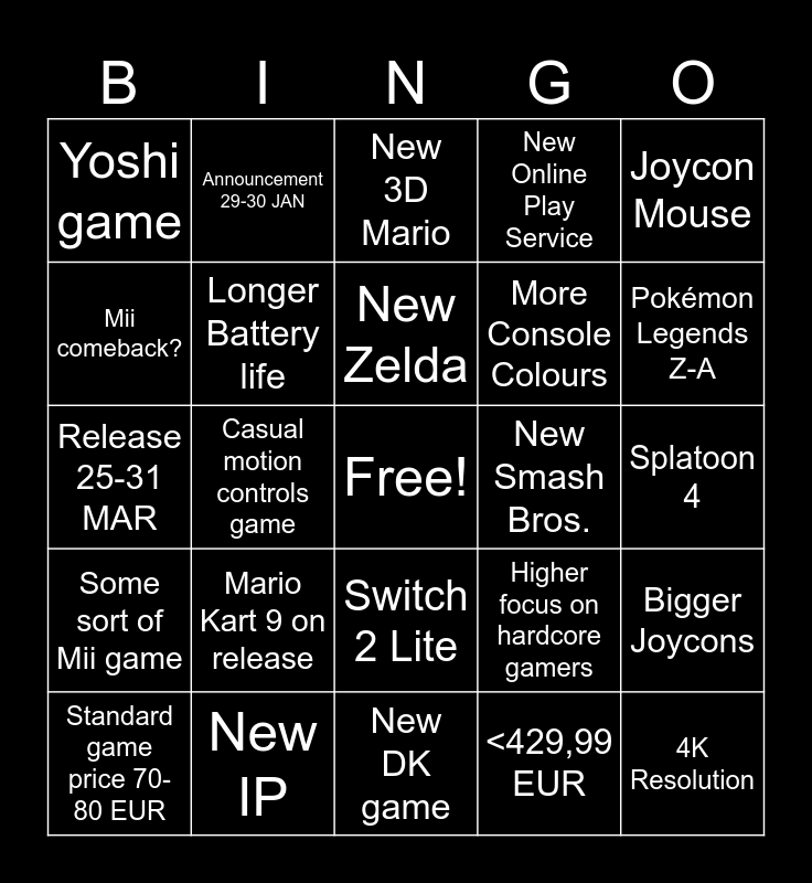 This bingo card has a free space and 24 words: Mario Kart 9 on release, New IP, New Zelda, Standard game price 70-80 EUR, Joycon Mouse, Yoshi game, Mii comeback?, Announcement 29-30 JAN, New Smash Bros., Switch 2 Lite, More Console Colours, Release 25-31 MAR, Higher focus on hardcore gamers, Bigger Joycons, Longer Battery life, <429,99 EUR, Splatoon 4, New 3D Mario, Pokémon Legends Z-A, Casual motion controls game, 4K Resolution, Some sort of Mii game, New Online Play Service and New DK game.