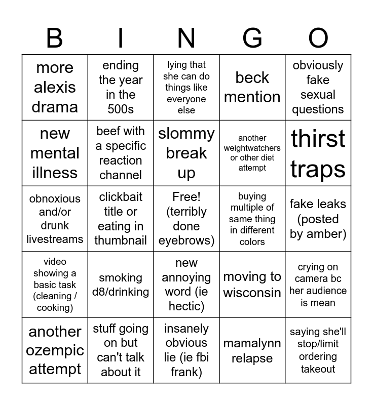 This bingo card has a free space and 24 words: smoking d8/drinking, stuff going on but can't talk about it, slommy break up, another ozempic attempt, obviously fake sexual questions, more alexis drama, new mental illness, ending the year in the 500s, buying multiple of same thing in different colors, new annoying word (ie hectic), another weightwatchers or other diet attempt, obnoxious and/or drunk livestreams, moving to wisconsin, crying on camera bc her audience is mean, beef with a specific reaction channel, mamalynn relapse, fake leaks (posted by amber), lying that she can do things like everyone else, thirst traps, clickbait title or eating in thumbnail, saying she'll stop/limit ordering takeout, video showing a basic task (cleaning / cooking), beck mention and insanely obvious lie (ie fbi frank).