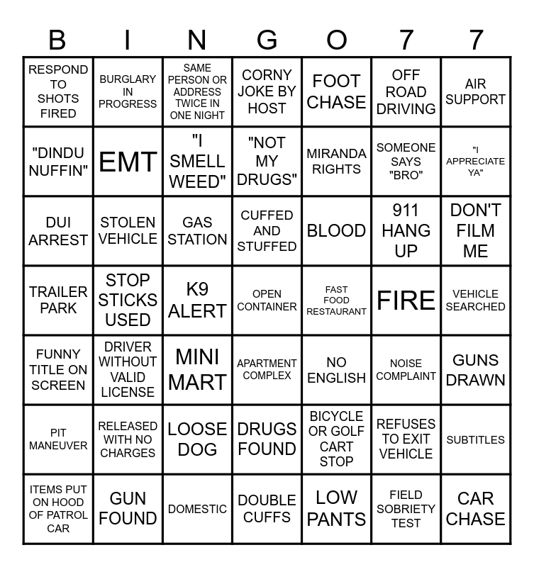 This bingo card has 56 words: FIELD SOBRIETY TEST, DON'T FILM ME, K9 DEPLOYED, RESPOND TO SHOTS FIRED, STOP STICKS USED, LOOSE DOG, AIR SUPPORT, ACTIVE WARRANT, EMT, DRUGS FOUND, CORNY JOKE BY HOST, PIT MANEUVER, FUNNY TITLE ON SCREEN, VEHICLE SEARCHED, GUN FOUND, DRIVER WITHOUT VALID LICENSE, FOOT CHASE, MIRANDA RIGHTS, CAR CHASE, SOMEONE SAYS "BRO", "I APPRECIATE YA", MINI MART, BLOOD, SAME PERSON OR ADDRESS TWICE IN ONE NIGHT, CAR CRASH, "DINDU NUFFIN", FIRE, SHIRTLESS MAN, "I SMELL WEED", APARTMENT COMPLEX, WAD OF CASH, GUNS DRAWN, ITEMS PUT ON HOOD OF PATROL CAR, DOMESTIC, DUI ARREST, OFF ROAD DRIVING, "NOT MY DRUGS", RELEASED WITH NO CHARGES, STOLEN VEHICLE, BURGLARY IN PROGRESS, CUFFED AND STUFFED, OPEN CONTAINER, BICYCLE OR GOLF CART STOP, FIRE TRUCK, SUBTITLES, GAS STATION, TRAILER PARK, DOUBLE CUFFS, NOISE COMPLAINT, FAST FOOD RESTAURANT, K9 ALERT, NO ENGLISH, REFUSES TO EXIT VEHICLE, LOW PANTS, 911 HANG UP and SHELL CASINGS FOUND.