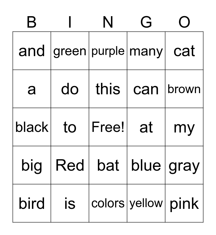This bingo card has a free space and 24 words: Red, is, this, bird, cat, and, a, green, at, bat, can, black, blue, gray, do, yellow, my, purple, brown, to, pink, big, many and colors.