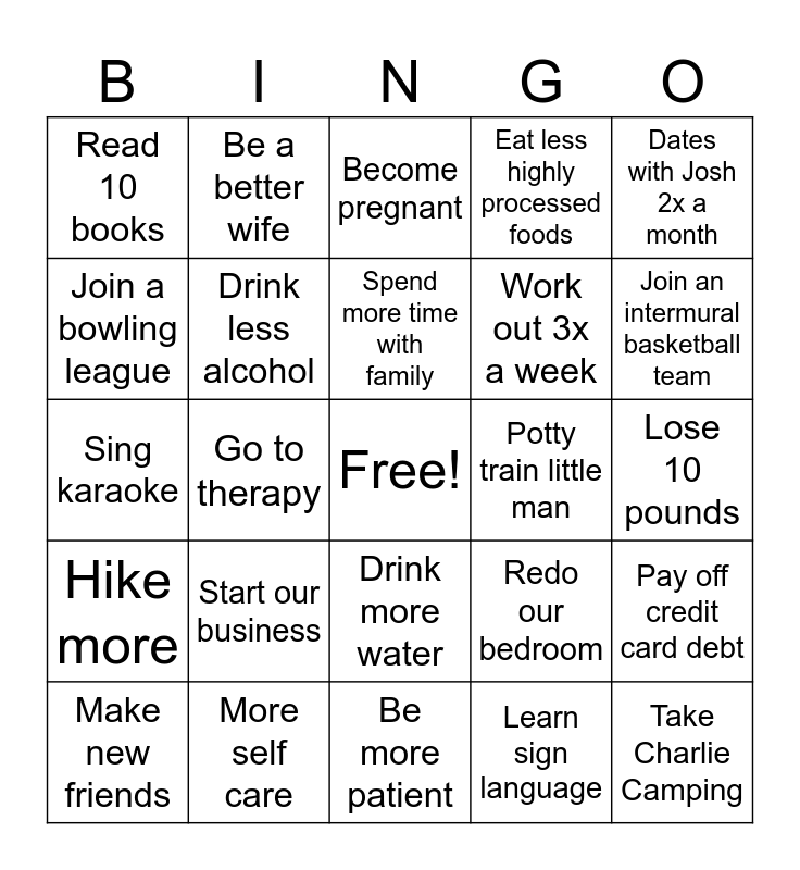 This bingo card has a free space and 24 words: Start our business, More self care, Spend more time with family, Make new friends, Dates with Josh 2x a month, Read 10 books, Join a bowling league, Be a better wife, Potty train little man, Drink more water, Work out 3x a week, Sing karaoke, Redo our bedroom, Pay off credit card debt, Drink less alcohol, Learn sign language, Lose 10 pounds, Become pregnant, Join an intermural basketball team, Go to therapy, Take Charlie Camping, Hike more, Eat less highly processed foods and Be more patient.