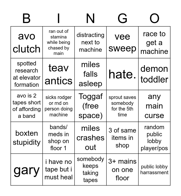 This bingo card has a free space and 41 words: risks life for research, avo is 2 tapes short of affording a band, dies floor 1-5, teav antics, i have no tape but i must heal, miles crashes out, miles falls asleep, cussing out over call, race to get a machine, boxten stupidity, sicks rodger or rnd on person doing machine, vee sweep, public lobby harrassment, any main curse, sprout saves somebody for the 5th time, bands/ meds in shop on floor 1, everybody leaves ele last minute except for 1 person, avo clutch, low stealth toon goes close to distractor, distracting next to machine, random public lobby player/pos, random public lobby player/neg, somebody keeps taking tapes, hate., death threats, blame, 3+ mains on one floor, does last machine while somebody is afk, demon toddler, miserable distraction attempt, over-apologizing (LOL), ran out of stamina while being chased by main, gary, nobody grabs a band, 3 of same items in shop, spotted research at elevator formation, peb distractor needs bark but on cooldown, purple, rage quit, rodger edging and miles bypasses the roblox filter.