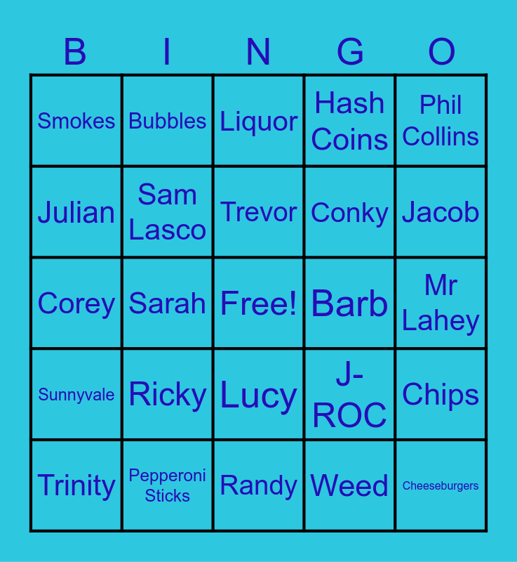 This bingo card has a free space and 24 words: Ricky, Pepperoni Sticks, Trevor, Trinity, Phil Collins, Smokes, Julian, Bubbles, Barb, Lucy, Conky, Corey, J-ROC, Chips, Sam Lasco, Weed, Mr Lahey, Liquor, Jacob, Sarah, Cheeseburgers, Sunnyvale, Hash Coins and Randy.