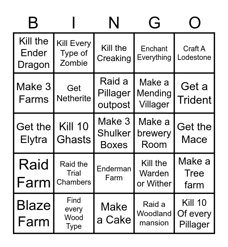 This bingo card has 35 words: Loot ancient city, Kill 20 Spiders, Reach level 60, Get Netherite, Enderman Farm, Enchant Everything, Make 3 Farms, Gold Farm, Raid a Pillager outpost, Get Ender Pearls from a Piglin, Get the Elytra, Craft A Lodestone, Get Mending on all Tools, Loot a bastion, Kill the Ender Dragon, Make a brewery Room, Raid a Woodland mansion, Kill 10 Ghasts, Raid Farm, Make 3 Shulker Boxes, Kill the Warden or Wither, Blaze Farm, Make a Tree farm, Find every Wood Type, Kill the Creaking, Get a Trident, Kill 10 Of every Pillager, Kill 10 Breezes, Make a Mending Villager, Get the Mace, Kill Every Type of skeleton, Make a Cake, Raid the Trial Chambers, Kill Every Type of Zombie and Get a Horse.