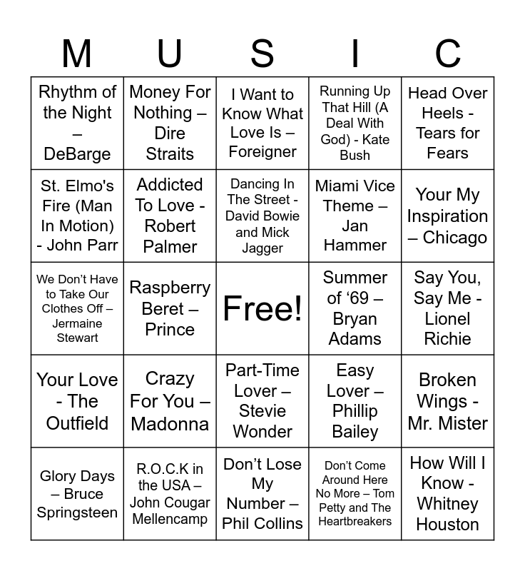 This bingo card has a free space and 37 words: Don’t You (Forget About Me) – Simple Minds, The Power of Love – Huey Lewis and the News, Take On Me – A-Ha, Addicted To Love - Robert Palmer, Broken Wings - Mr. Mister, Crazy For You – Madonna, Dancing In The Street - David Bowie and Mick Jagger, Dead Man's Party - Oingo Boingo, Head Over Heels - Tears for Fears, Party All The Time - Eddie Murphy, Raspberry Beret – Prince, Running Up That Hill (A Deal With God) - Kate Bush, How Will I Know - Whitney Houston, Say You, Say Me - Lionel Richie, St. Elmo's Fire (Man In Motion) - John Parr, Your Love - The Outfield, Careless Whisper – WHAM!, I Want to Know What Love Is – Foreigner, Part-Time Lover – Stevie Wonder, Summer of ‘69 – Bryan Adams, Rhythm of the Night – DeBarge, Your My Inspiration – Chicago, Glory Days – Bruce Springsteen, Don’t Lose My Number – Phil Collins, All She Wants to Do Is Dance – Don Henley, Don’t Come Around Here No More – Tom Petty and The Heartbreakers, Money For Nothing – Dire Straits, Word Up! – Cameo, Living In America – James Brown, Broken Wings – Mr. Mister, We Built This City – Starship, R.O.C.K in the USA – John Cougar Mellencamp, We Don’t Have to Take Our Clothes Off – Jermaine Stewart, Can’t Fight This Feeling – REO Speedwagon, Easy Lover – Phillip Bailey, Miami Vice Theme – Jan Hammer and Out of Touch – Daryl Hall and John Oates.