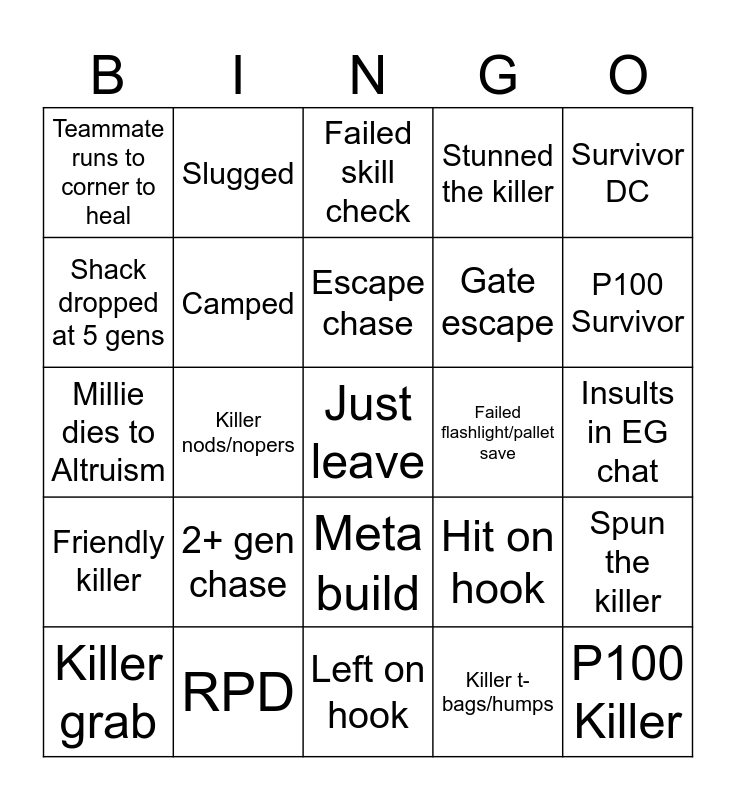 This bingo card has 51 words: Teammate t-bags, Just leave, Hatch escape, Left on hook, 2+ gen chase, Flashlight/pallet save, Slugged, Killer DC, Shack dropped at 5 gens, Sandbagged, Camped, Stunned the killer, Spun the killer, Hit on hook, Teammate gives up, Tunneled, Escape chase, Failed flashlight/pallet save, TTV, Survivor DC, Killer nods/nopers, Killer t-bags/humps, Teammate runs to corner to heal, Gate escape, Self-care, P100 Killer, P100 Survivor, EG save, Killer grab, Failed skill check, Mori’d, 4% Kobe, Survivor wiggles, Basement killer, T-bags at gate, RPD, Boons, Jump scared, Hitboxes/ ping, 3 gen, Insults in EG chat, Friendly killer, Killer gives up, 7% skill check, Teammate wtf, Crowe goes AFK at start of match, Millie dies to Altruism, Console player, Map offerings, Meta build and Funny names.