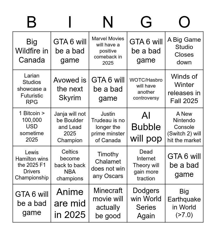 This bingo card has a free space and 29 words: GTA 6 will be a bad game, A New Civil War in Middle East/Asia, Janja will not be Boulder and Lead 2025 Champion, Lebron Retires, Big Wildfire in Canada, Marvel Movies will have a positive comeback in 2025, Avowed is the next Skyrim, Celtics become back to back NBA champions, AI Bubble will pop, Anime are mid in 2025, A New Nintendo Console (Switch 2) will hit the market, Big Earthquake in World (>7.0), Minecraft movie will actually be good, Dodgers win World Series Again, Winds of Winter releases in Fall 2025, Economic Depression in Canada due to Tariffs, Timothy Chalamet does not win any Oscars, Lewis Hamilton wins the 2025 F1 Drivers Championship, A Big Game Studio Closes down, 1 Bitcoin > 100,000 USD sometime 2025, Dead Internet Theory will gain more traction, Silksong will release in 2025, WOTC/Hasbro will have another controversy, Larian Studios showcase a Futuristic RPG, GTA 6 will be a bad game, GTA 6 will be a bad game, GTA 6 will be a bad game, GTA 6 will be a bad game and GTA 6 will be a bad game.