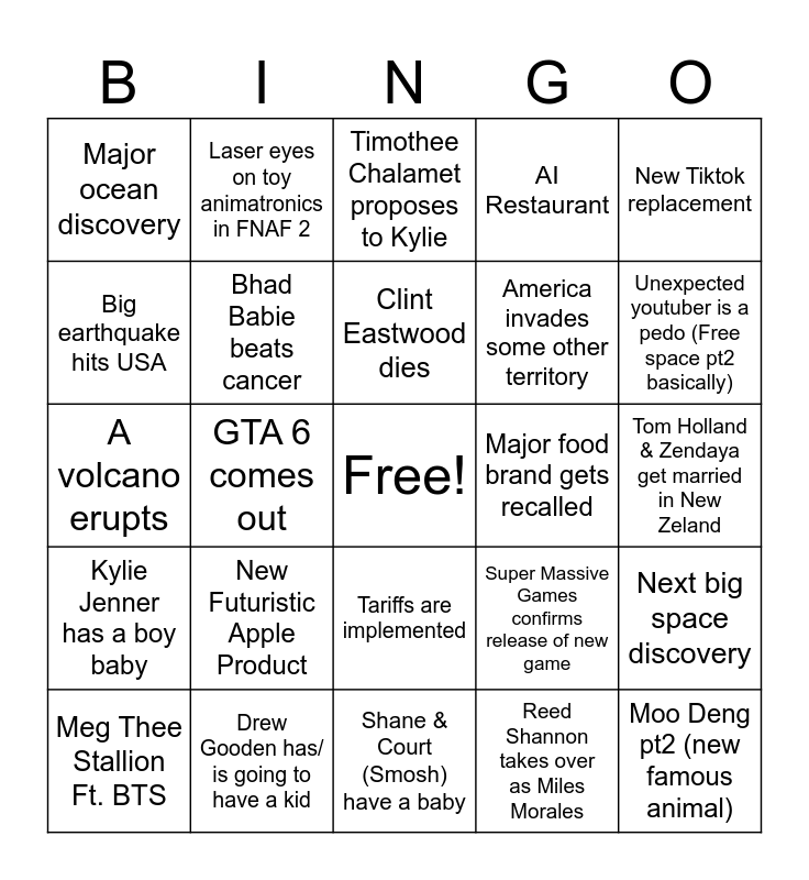 This bingo card has a free space and 24 words: New Futuristic Apple Product, Drew Gooden has/ is going to have a kid, Clint Eastwood dies, Meg Thee Stallion Ft. BTS, New Tiktok replacement, Major ocean discovery, Big earthquake hits USA, Laser eyes on toy animatronics in FNAF 2, Major food brand gets recalled, Tariffs are implemented, America invades some other territory, A volcano erupts, Super Massive Games confirms release of new game, Next big space discovery, Bhad Babie beats cancer, Reed Shannon takes over as Miles Morales, Tom Holland & Zendaya get married in New Zeland, Timothee Chalamet proposes to Kylie, Unexpected youtuber is a pedo (Free space pt2 basically), GTA 6 comes out, Moo Deng pt2 (new famous animal), Kylie Jenner has a boy baby, AI Restaurant and Shane & Court (Smosh) have a baby.