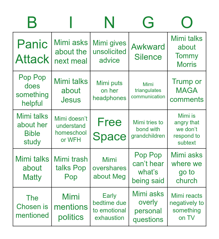 This bingo card has a free space and 24 words: The Chosen is mentioned, Mimi trash talks Pop Pop, Mimi puts on her headphones, Mimi asks overly personal questions, Mimi talks about Tommy Morris, Panic Attack, Mimi asks about the next meal, Mimi gives unsolicited advice, Mimi tries to bond with grandchildren, Mimi is angry that we don’t respond to subtext, Mimi talks about her Bible study, Mimi talks about Jesus, Pop Pop can’t hear what’s being said, Mimi asks where we go to church, Pop Pop does something helpful, Mimi mentions politics, Early bedtime due to emotional exhaustion, Awkward Silence, Trump or MAGA comments, Mimi talks about Matty, Mimi doesn’t understand homeschool or WFH, Mimi overshares about Meg, Mimi triangulates communication and Mimi reacts negatively to something on TV.