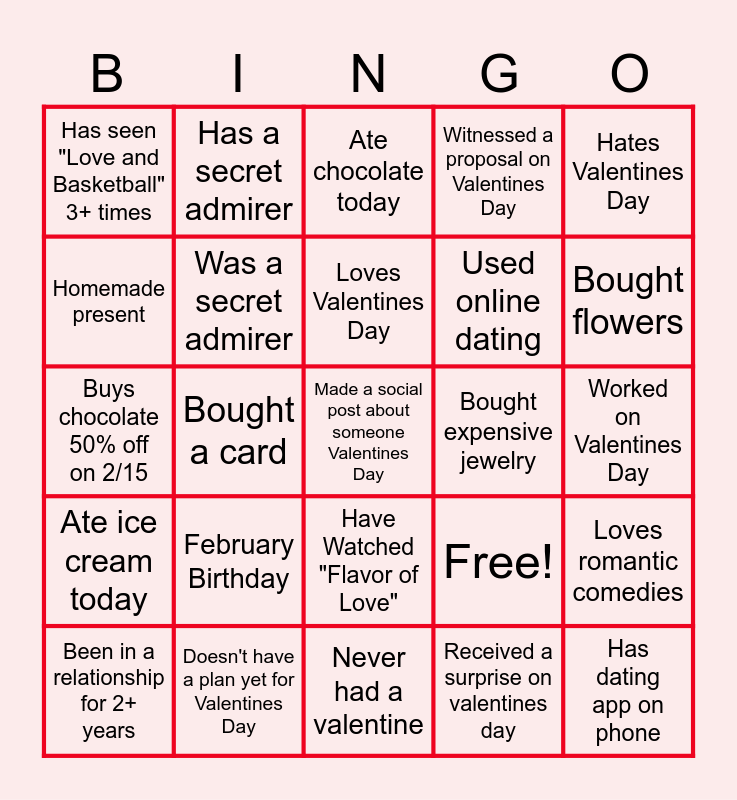 This bingo card has 25 words: February Birthday, Never had a valentine, Loves Valentines Day, Been in a relationship for 2+ years, Hates Valentines Day, Has seen "Love and Basketball" 3+ times, Homemade present, Has a secret admirer, Bought expensive jewelry, Have Watched "Flavor of Love", Used online dating, Buys chocolate 50% off on 2/15, Free!, Loves romantic comedies, Was a secret admirer, Has dating app on phone, Worked on Valentines Day, Ate chocolate today, Bought flowers, Bought a card, Made a social post about someone Valentines Day, Doesn't have a plan yet for Valentines Day, Ate ice cream today, Witnessed a proposal on Valentines Day and Received a surprise on valentines day.