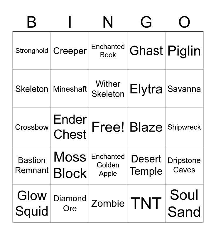 This bingo card has a free space and 73 words: Village, Pillager Outpost, Stronghold, End City, Nether Fortress, Woodland Mansion, Bastion Remnant, Ocean Monument, Desert Temple, Jungle Temple, Igloo, Ruined Portal, Mineshaft, Shipwreck, Ancient City, Creeper, Zombie, Skeleton, Enderman, Blaze, Wither Skeleton, Ghast, Piglin, Axolotl, Glow Squid, Wandering Trader, Phantom, Iron Golem, Llama, Warden, Diamond Ore, Ancient Debris, Beacon, Lodestone, Ender Chest, Amethyst Block, Honey Block, Obsidian, Soul Sand, Redstone Lamp, TNT, Moss Block, Scaffolding, Nether Wart Block, Crying Obsidian, Elytra, Enchanted Book, Potion of Healing, Netherite Sword, Crossbow, Shield, Fishing Rod, Trident, Saddle, Lead, Totem of Undying, Firework Rocket, Enchanted Golden Apple, Name Tag, Cake, Desert, Jungle, Plains, Savanna, Snowy Tundra, Deep Dark, Badlands, Swamp, Dripstone Caves, Frozen Ocean, Lush Caves, Mushroom Fields and Mangrove Swamp.
