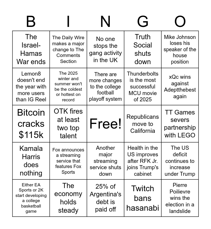 This bingo card has a free space and 24 words: Fox announces a streaming service that features Fox Sports, The economy holds steady, There are more changes to the college football playoff system, Either EA Sports or 2K start developing a college basketball game, Mike Johnson loses his speaker of the house position, The Israel-Hamas War ends, Lemon8 doesn't end the year with more users than IG Reel, The Daily Wire makes a major change to The Comments Section, Republicans move to California, Another major streaming service shuts down, Thunderbolts is the most successful MCU movie of 2025, Bitcoin cracks $115k, Health in the US improves after RFK Jr. joins Trump's cabinet, The US deficit continues to increase under Trump, The 2025 winter and summer won't be the coldest or hottest on record, Twitch bans hasanabi, TT Games severs partnership with LEGO, No one stops the gang activity in the UK, xQc wins against Adeptthebest again, OTK fires at least two top talent, Pierre Poilievre wins the election in a landslide, Kamala Harris does nothing, Truth Social shuts down and 25% of Argentina's debt is paid off.